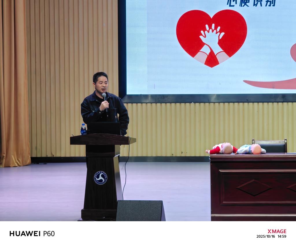 讲座的高潮出现在实操技能教学部分。讲师利用模拟人道具,逐步演示了针对成人、儿童及婴儿的海姆立克急救法差异。在创伤救护环节,从直接压迫止血、加压包扎到止血带的使用禁忌,每一步都清晰示范,确保师生能根据不同伤情采取正确策略,避免二次伤害。最后,讲师系统讲解了心肺复苏(CPR)的全流程,包括意识判断、开放气道、人工呼吸以及胸外按压的深度与频率,并重点强调了与AED(自动体外除颤仪)协同使用的重要性,让“CPR+AED”这一生命救援的“黄金组合”深入人心。